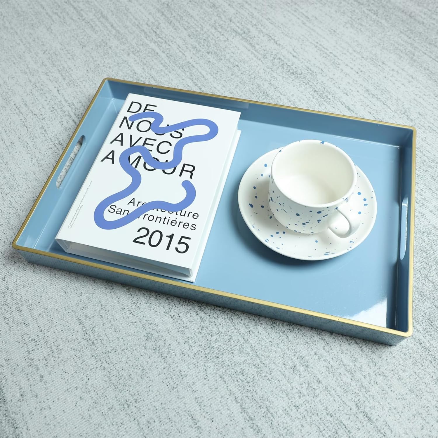 Introducing the Spsyrine Blue Decorative Tray, the perfect addition to your home decor collection. This elegant plastic serving tray features stylish handles for easy carrying and a sleek design that will enhance any coffee table or ottoman.